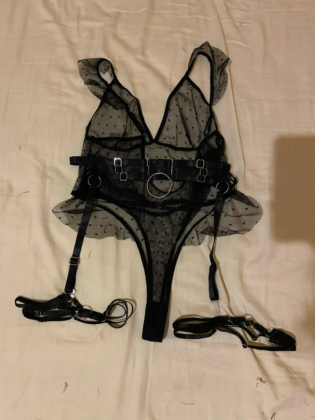 Samo body jest urocze, miłe w dotyku, ale dodatki podkreślają seksowny charakter całej stylizacji. Bardzo zaskoczył mnie w paczce choker na szyję, mniejsza wersja harnessa, który modelka ma na sobie jako pas do pończoch. Jak dla mnie wisienka na torcie - czegoś takiego szukałam 😉